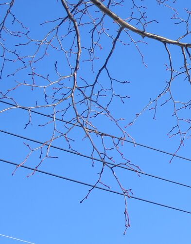 昨日は最高気温-1度と少し上がったが、足元の雪は片栗粉の様に軋んだ。1時半過ぎに、散歩に出かけた。街路樹のシナノキに、赤く艶のある冬芽が出ていた。冬芽を見ながら、南へ進む。南の住宅街のネムノキの葉は落ちていたが、実の莢は残っていた。空家の柿の…