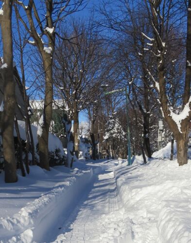 曇の予報だったのに、昨日は朝方の雲が消えて、良く晴れた。9時半過ぎに、散歩に出かけた。夜を徹しての作業だったのだろうか、車道は元より、遊歩道も除雪済みだった。しらかば公園の遊歩道を、北へ向かう。 3番通りを越えた北の住宅街の公園のポプラの梢…